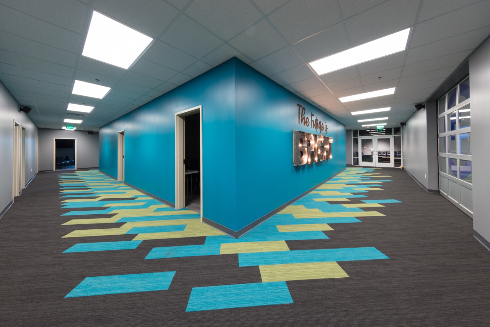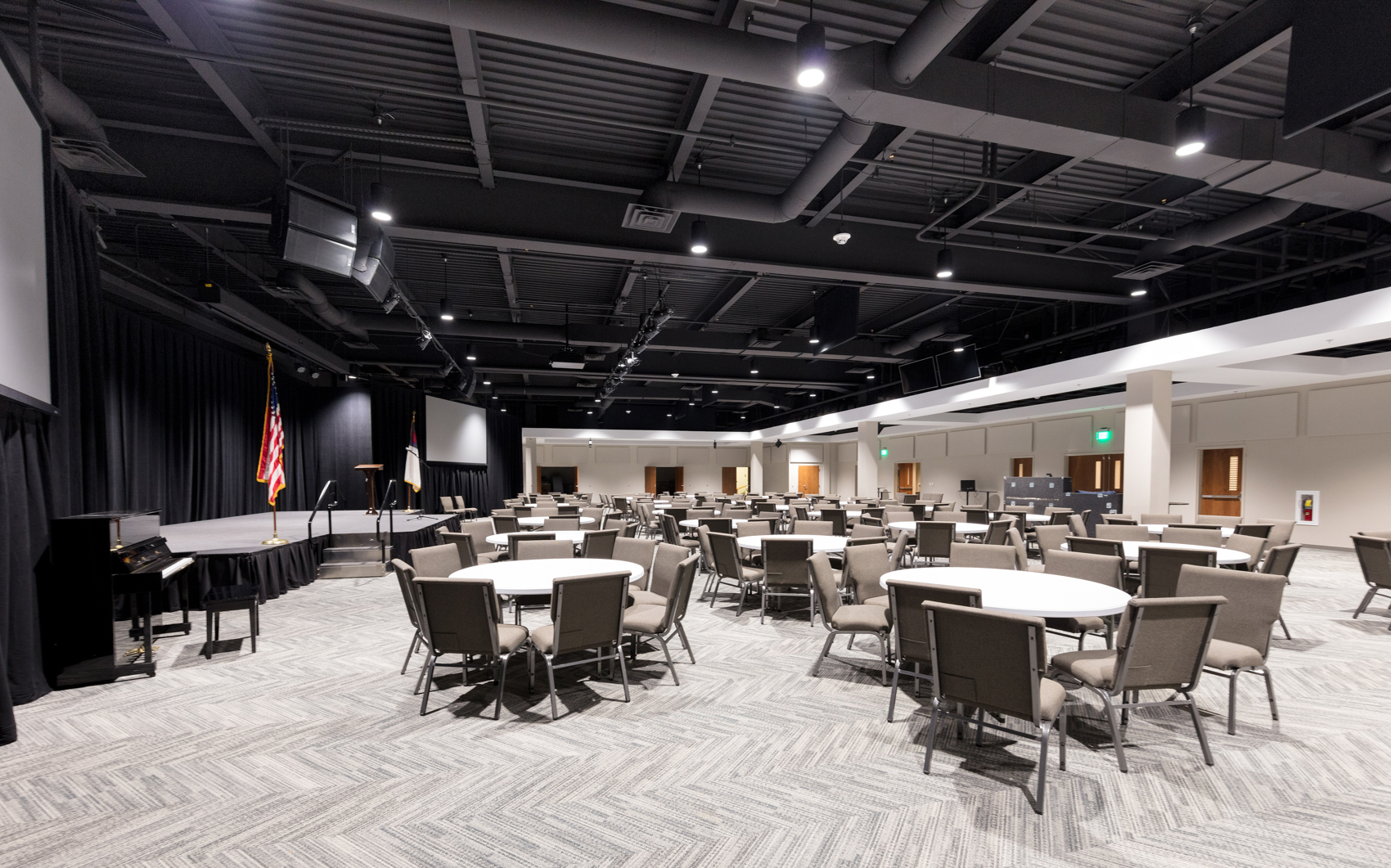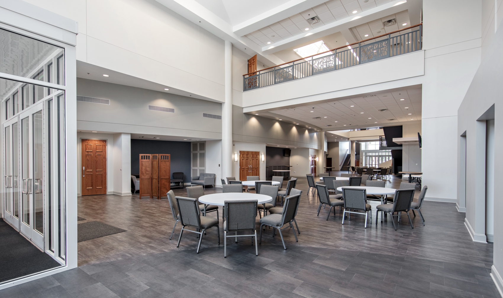 McCrory and design partner LS3P created this state-of-the-art facility for First Baptist Simpsonville — the final phase of a long-term master plan implemented on the church's downtown campus. Designed to serve all ages, the three-story Family Ministries facility encompasses 55,000 square feet of modern worship, multipurpose, dining, and classroom space. The focal point of the first floor is a sizable "fellowship hall," supported by a commercial grade kitchen. A smaller, more intimate dining space is located next to the kitchen. Classrooms for adults and youth — along with associated amenities — are located on the second and third floors, respectively.